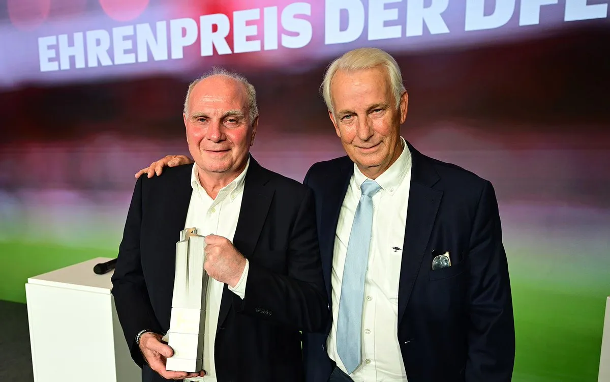 来源:德国足球职业联盟官网虎扑09月03日讯 德国足球联盟(DFL)在周二晚间的大会前夕,向拜仁慕尼黑名誉主席乌利-赫内斯颁发了荣誉奖,以表彰他对德国职业足球所作出的杰出贡献。