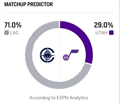 今日ESPN给出本场胜率预测,快船高达71.0%,爵士为29.0%。