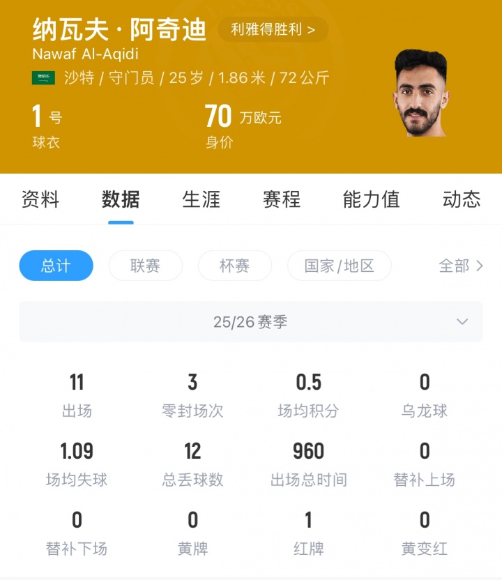 阿奇迪现年25岁,身高1.86米,他本赛季为利雅得胜利出场11次丢12球,有3次零封。据罗马诺报道,胜利已经紧急叫停了本托的转会。